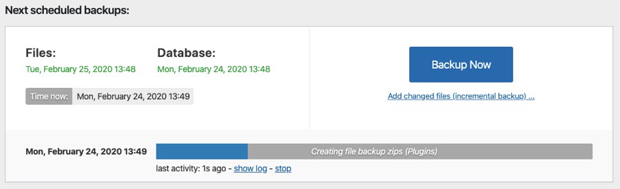 Nu u uw opslaglocatie hebt ingesteld en hoe vaak u een back-up van uw site wilt maken, voert UpdraftPlus automatisch uw eerste back-up van de site uit zonder dat u iets hoeft te doen.