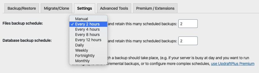 Hier kunt u plannen hoe vaak UpdraftPlus een nieuwe back-up maakt. U kunt het schema kiezen dat bij u en uw site past. Als u bijvoorbeeld uw site regelmatig bijwerkt met nieuwe pagina’s en berichten, kan een frequentere back-up nodig zijn.