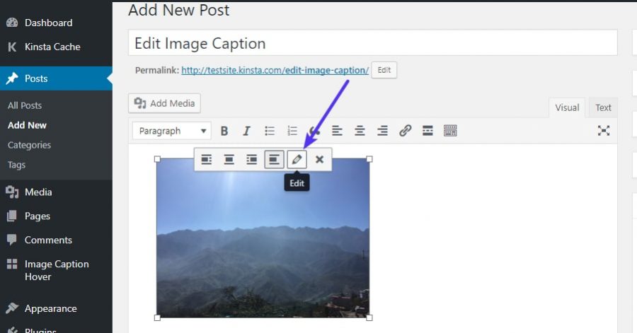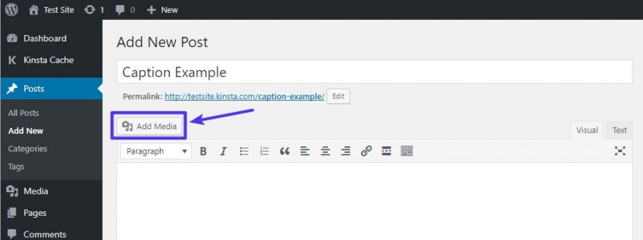 Om te beginnen, maakt je een nieuw bericht / pagina of bewerk je de afbeelding waaraan je het bijschrift wilt toevoegen. In WordPress kun je afbeeldingen, foto’s of plaatjes toevoegen door op de ‘Add Media’ knop boven de WordPress editor te klikken, of door de afbeeldingen naar het veld te slepen.