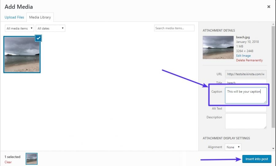 Alles dat je in het Onderschrift veld typt, zal zichtbaar worden aan de de ‘voorkant’ van je WordPress website. Je kunt hier dus je tekst invoeren.