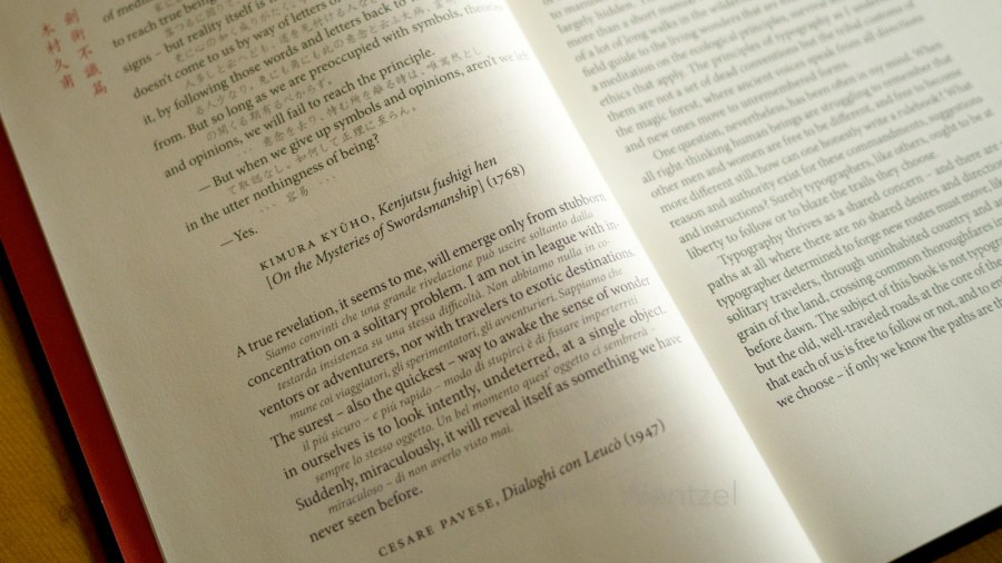 De debatten die ons gebracht hebben tot wat we waarderen in goede typografie, de vragen die betwist blijven, de eigenlijke middelen om principes in de praktijk om te zetten voor studenten, zijn hier niet. En dat hoeft ook niet. Bringhurst is de onofficiële dichter van de typografie, en nog een geweldige ook. Maar wat ik van Robert Frost ooit opstak is de betekenis van houtsnijden, niet per se hoe je een boom velt of een koord brandhout stapelt.