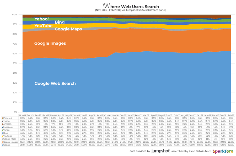 De laatste jaren merk ik de onnauwkeurige, niet-representatieve gegevensbronnen over hoe het verkeer op het web verloopt en waar de zoekopdrachten op het web plaatsvinden. Sommige daarvan zijn goedbedoelde fouten, terwijl andere het gevoel hebben dat ze een specifieke motivatie hebben. Maar een bron die altijd uitstekend is geweest, is Jumpshot, een verzamelaar en aanbieder van geanonimiseerde, clickstream-niveau gegevens van miljoenen echte mensen browsers (zowel mobiel als desktop).